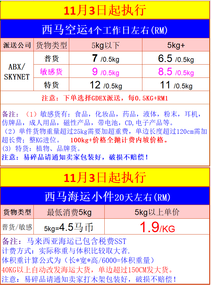 * 默认体积重与实重比较,取较重者计算运费,免抛/半抛优惠请参考报价说明。